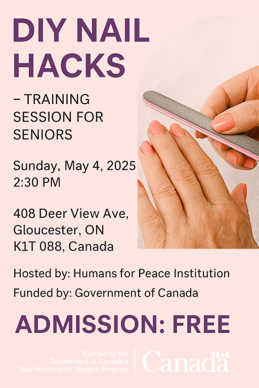L’Institution Humans for Peace est ravie d’annoncer la tenue prochaine d’une séance de formation en présentiel destinée aux aînés, intitulée « Astuces Ongles DIY », qui se déroulera le dimanche 4 mai 2025 à 14h30. L’événement aura lieu au 408 Deer View Ave, Gloucester, ON K1T 0B8, Canada, et est fièrement financé par le gouvernement du Canada.